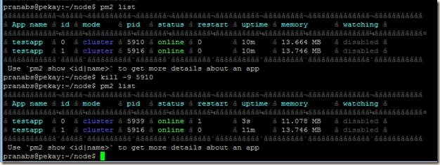 pm2 automatically starts a failed process. To verify that we will forcefully kill one of the processes and check whether pm2 starts another process for the failed one. Here I killed the process 5910, and we could see in the below screenshot that pm2 had started another process with ID 5939.Starting applications automatically at server boot time